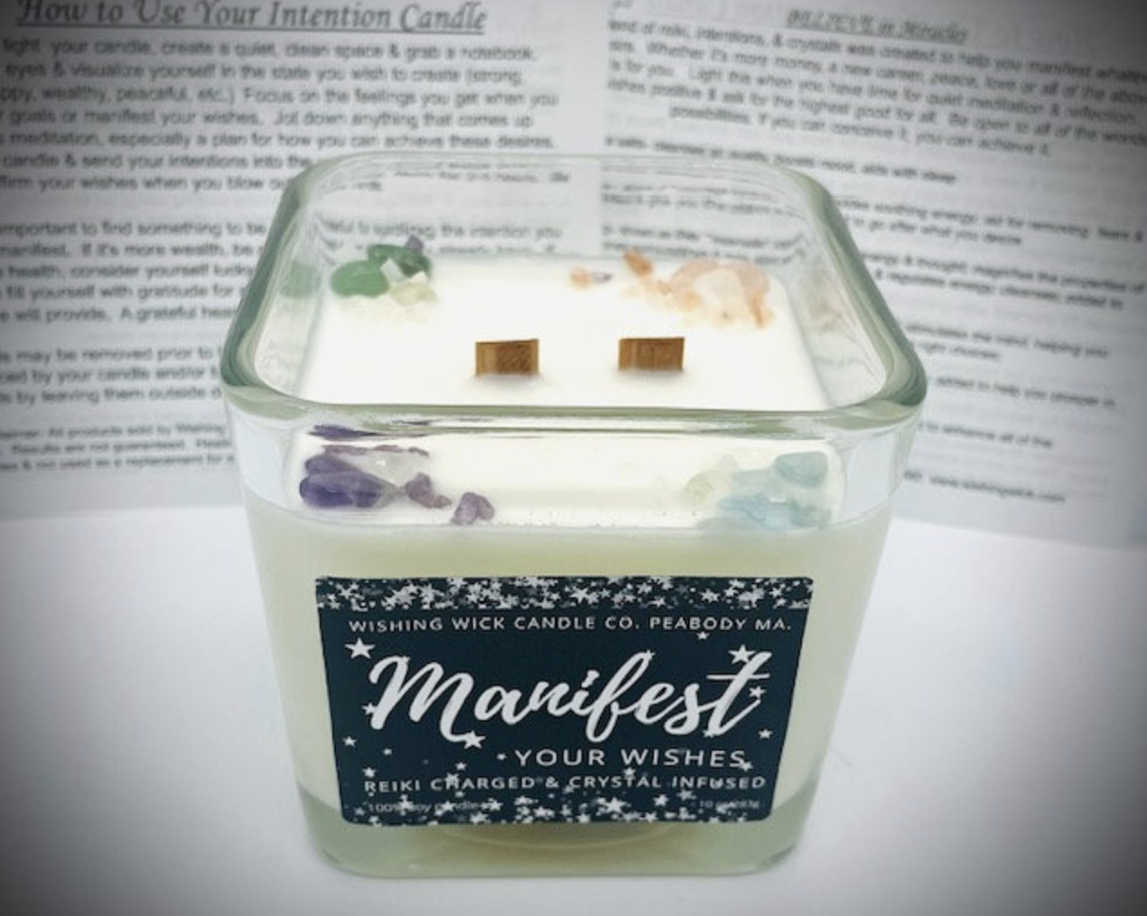 This candle called the “Manifest Your Wishes” candle, has crystals inside it such as aquamarine, clear quartz, amethyst, and rose quartz, which are so beautiful to look at! The candle is Lavender, Birch, and Sage and is very scented without being overpowering.